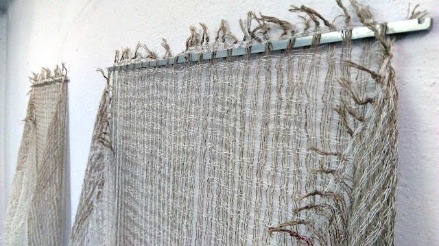 Dzikie tkactwo w procesie... Po raz pierwszy do wykonania tkaniny użyłam grubych, autorskich wątków. Inspiracją do ich stworzenia są nonszalanckie pociągnięcia pędzla w malarstwie Alfa Löhra, którego twórczość cechuje radosna pogoń za światłem i swoboda ciętej linii koloru. // Wild weaving in process. Gentle interference in the landscape. Leaving already known shapes... First time while weaving I painted the thick jute wefts, not the linen warp, being inpired by the 'nonchalant brushstrokes' in the series of paintings by Alf Löhr.